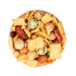 Ingredientes: Almidón de maíz, harina de maíz, CACAHUETE, harina de TRIGO, azúcar, semilla de SÉSAMO, salsas de SOJA (agua, SOJA, TRIGO, sal y alcohol), almidón de patata, almidón modificado de tapioca E1451, dextrina, colorante (E150a), corrector de acidez (E503ii, E500ii), algas, colorante (E160c), jarabe de almidón, polvo de cebolla, sal, glucosa, colorante (e-140), polvo de glucosa, polvo de ajo, extracto rojo de pimienta.